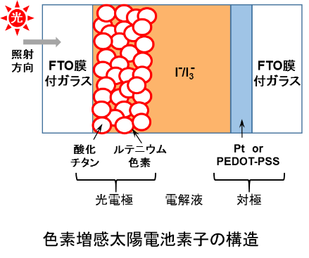 酸化チタン表面にルテニウム色素を吸着させ作製した光電極を白金のような対極との間を電解液で満たすという簡単な素子構造である色素増感太陽電池は有機系太陽電池の中で最も変換効率が高く、しかも軽量で、フレキシブルな素子を作製できるため、将来的に様々な分野への応用が生まれることが期待されています。さらなる効率向上のために、様々な形態を有する酸化物ナノ構造を有する色素増感太陽電池の研究開発を行っています