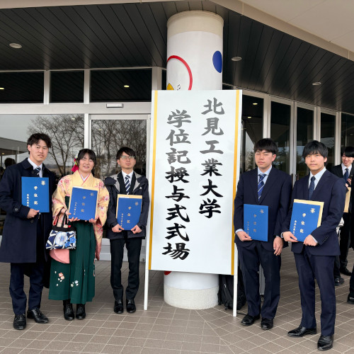 令和8年3月19日 北見工業大学の学位授与式がおこなわれ、北舘・北澤・高田の3名に修士(工学)の学位が、 山下・藤原・倉岡の3名に学士(工学)の学位がそれぞれ授与されました。北舘は、工学専攻全体の代表として登壇し、 学長から直接学位記を受け取っています。学位が授与された6名学生たち、本当におめでとうございます。